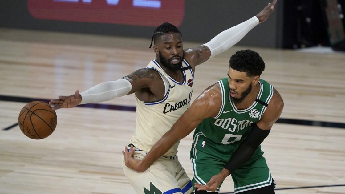 Bucks' Wesley Matthews defends Celtics' Jayson Tatum during the second half Friday in Lake Buena Vista, Fla.