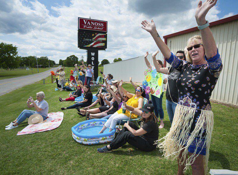 Vanoss Elementary School teachers gathered along the road leading from the school Thursday as they waved goodbye to their students on the last day of school. The teachers dressed in beach attire, with wading pools and water guns.